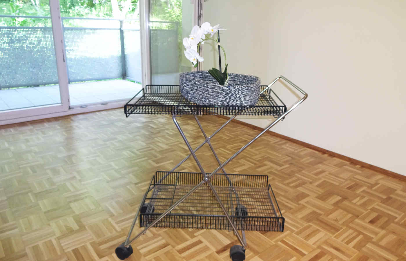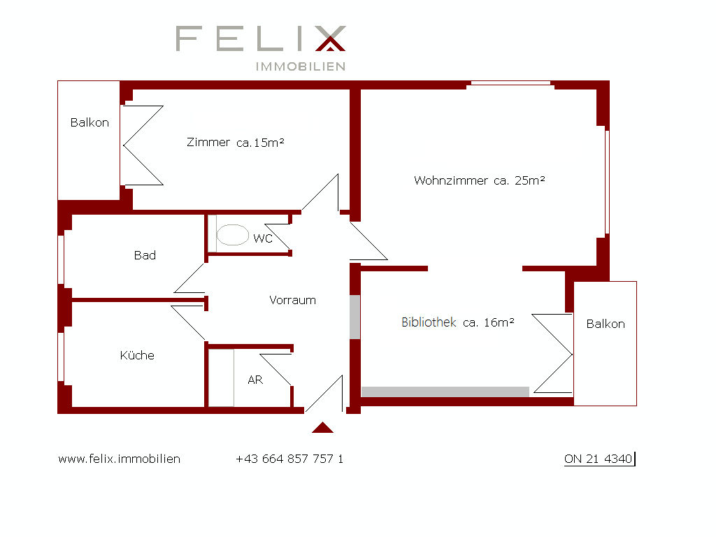 Nord-Ost-Süd Ausrichtung mit großzügigem Wohnraum, reizender Bibliothek mit Balkon, ruhigem Schlafzimmer mit Balkon, nostalgischer Küche, elegantem Badezimmer, separater Toilette und nicht zuletzt dem praktischen  Abstellraum.