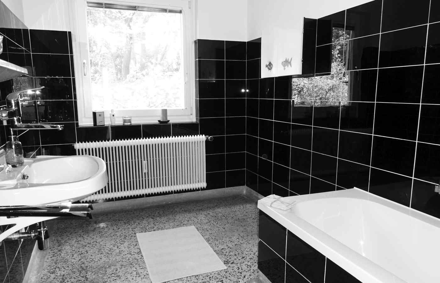 Klassischer Stäbchenparkett (Kachelmuster) in den Wohnräumen, Vorraum Linoleum in ansprechendem Rot. Die Nassräume sind verfliest. Das große Badezimmer - es ist in elegantem Schwarz gehalten, der Boden "original Terrazzo" von anno dazumal. An allen Fenstern, doppelt verglast und aus Kunststoff, wurde eine Beschattung in Form von Lamellenrollos, angebracht.