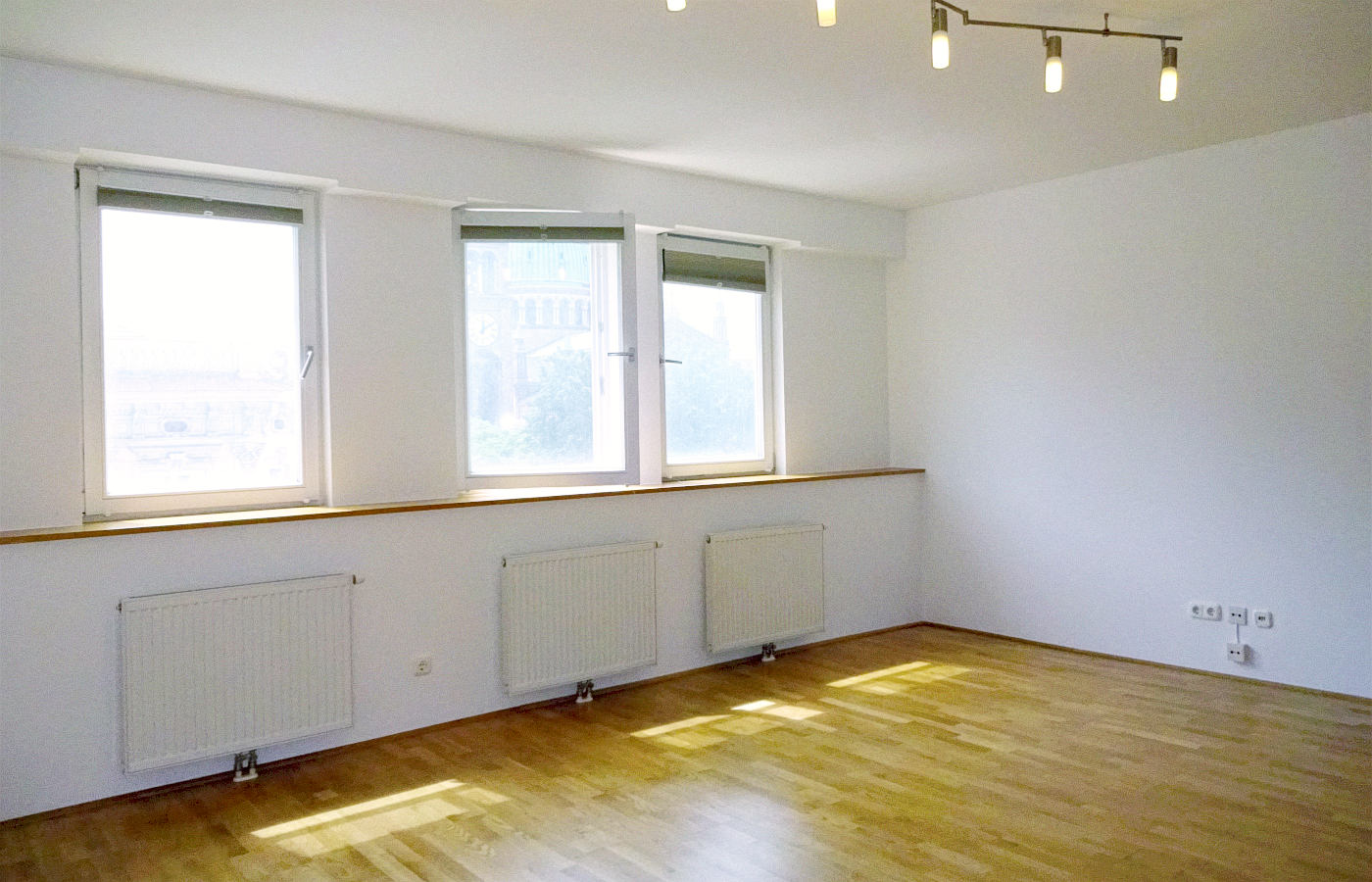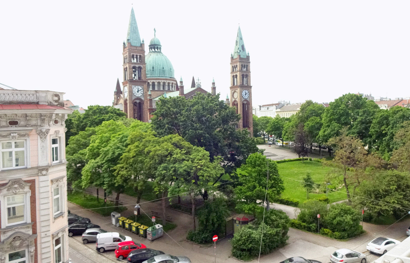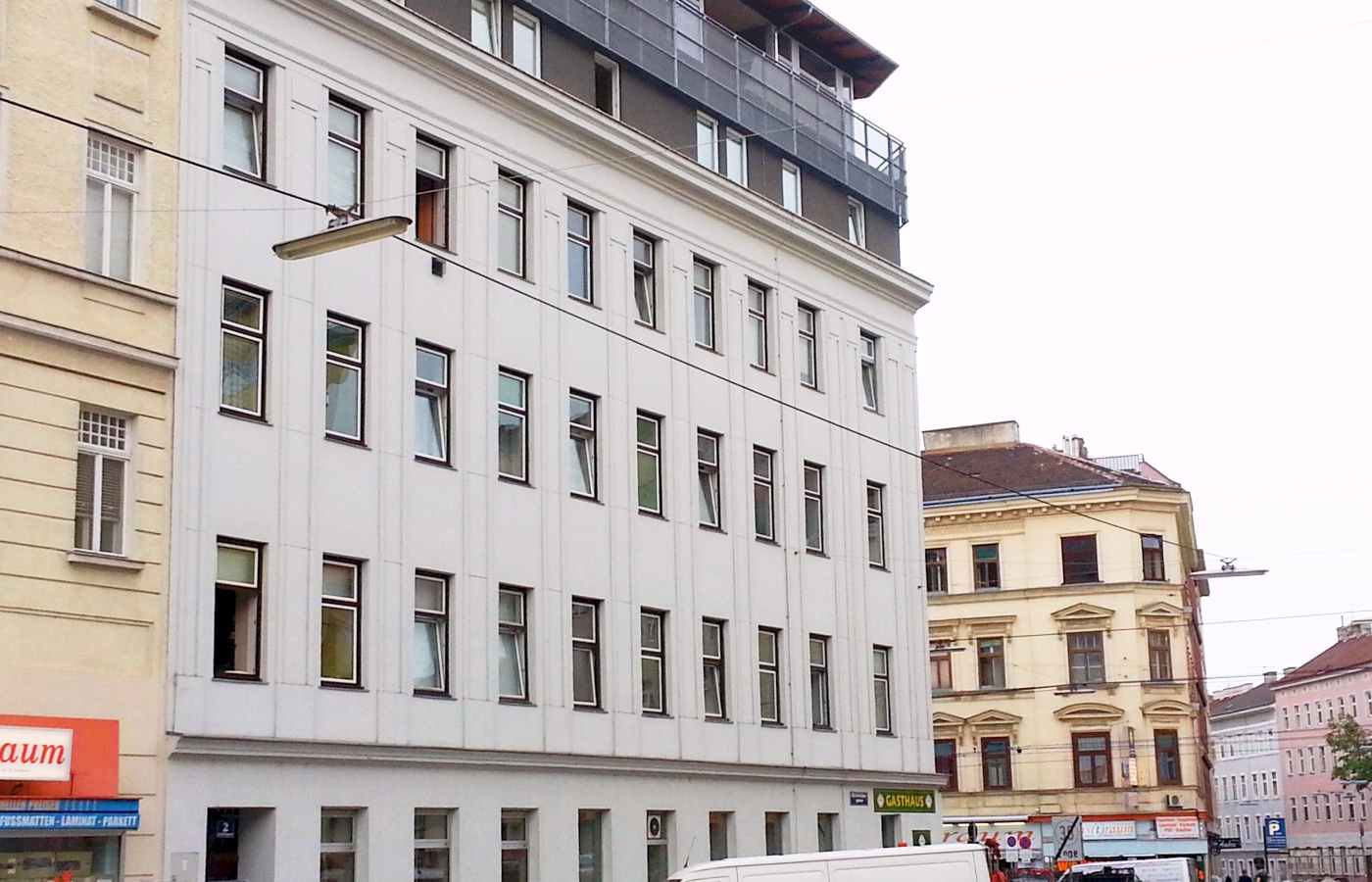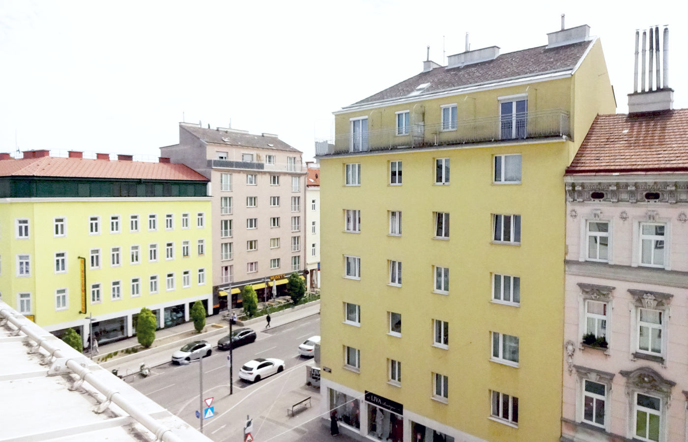 In der Schröttergasse, Ecke Favoritenstraße. Das Gebäude ist grad' 2 Minuten vom Reumannplatz entfernt. Die Wohnung mit Terrasse und Fernblick liegt im ausgebauten Dachgeschoss (5. Geschossebene) des sehr schön renovierten, eleganten Althauses.